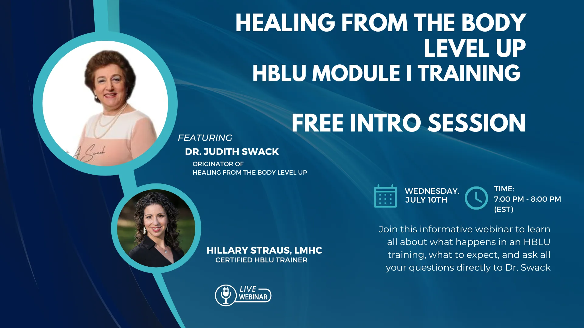 Have you been considering taking the HBLU Module 1 training but not sure what to expect?  This is your chance to learn exactly all the amazing healing that is in store from the creator of HBLU, Dr. Judith Swack, along with Certified HBLU Trainer, Hillary Straus.  There will be time for questions as well.